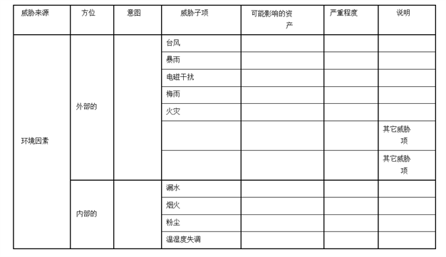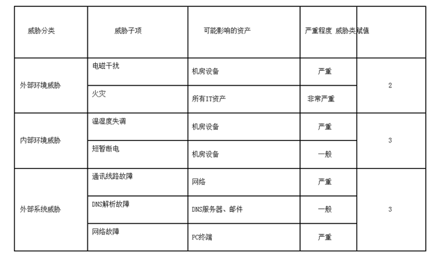 威胁统计分析:3大类威胁(环境、系统、人为),7子类获取威胁统计,7子类,34项;4级威胁2子类2项;3级威胁6子类16项;2级威胁5子类16项。